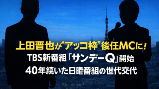 上田晋也がTBS新番組「上田晋也のサンデーQ」でMCに就任。40年続いた「アッコにおまかせ!」枠の後任番組としてスタートし、生情報番組MCに初挑戦。番組内容や和田アキ子のコメント、サンジャポ太田光との関係などを解説。