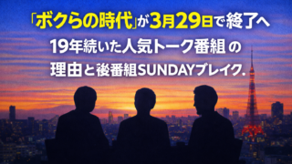 フジテレビのトーク番組「ボクらの時代」が2026年3月29日で終了。19年続いた番組の魅力や終了理由、名場面、後番組「SUNDAYブレイク.」(MC谷原章介)について詳しく解説します。