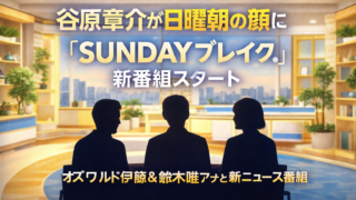 フジテレビの新ニュース情報番組『SUNDAYブレイク.』が2026年3月29日スタート。MCは谷原章介、スペシャルキャスターにオズワルド伊藤俊介、ニュースキャスターに鈴木唯アナ。番組内容や日曜朝の番組改編について解説します。