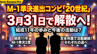 M-1準決進出コンビ「20世紀」が3月31日で解散。結成11年の実績や公式コメント、ラストライブ情報、解散後も吉本所属で新相方探しを続ける今後の活動をまとめました。