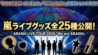 嵐のライブツアー「We are ARASHI」公式グッズ全25種が公開。ARASHIライトやジャンボうちわ、値段やデザインへの反応、販売スケジュールをわかりやすく解説。